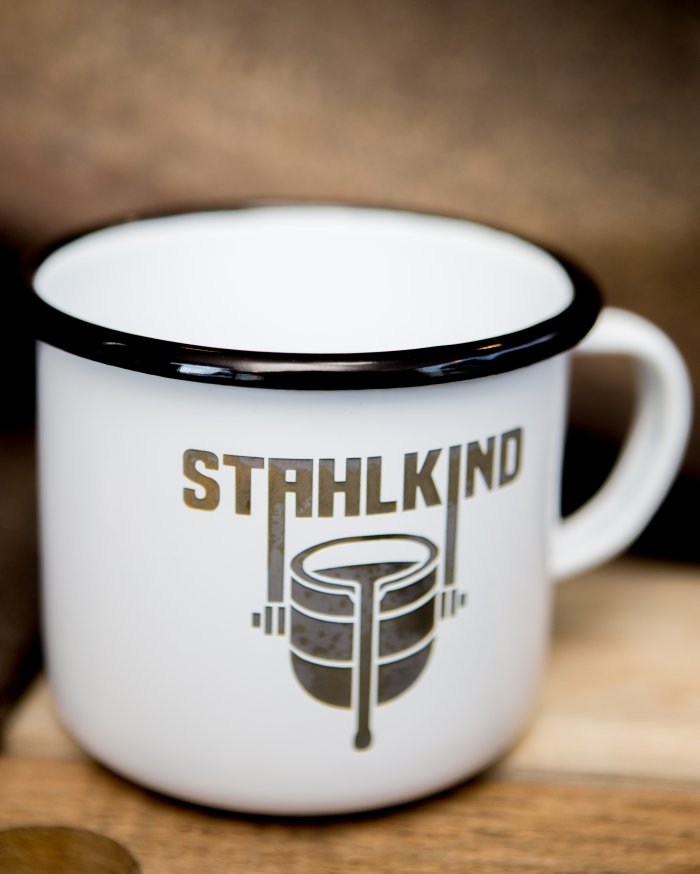 DER Hingucker in der Kaffeebude! Ein Blickfang mit großem Volumen (0,41 l). Das Stahlkindlogo ist sandgestrahlt und wird nach ein paar Spülgängen eine (beabsichtigte) Rostoptik annehmen. Als echte Emailletasse ist sie auch für den Campingkocher geeignet - Aber Vorsicht: heiß!